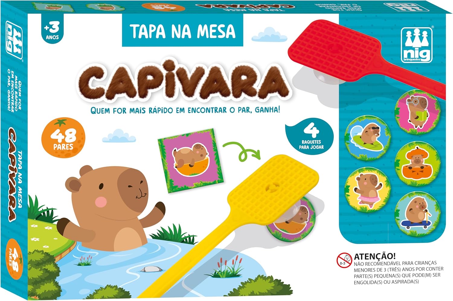 O objetivo é ser mais rápido que os outros jogadores: quando as cartas são reveladas na mesa, os participantes devem usar a raquete para bater na carta correta e formar pares. Quem conseguir mais combinações vence a rodada!